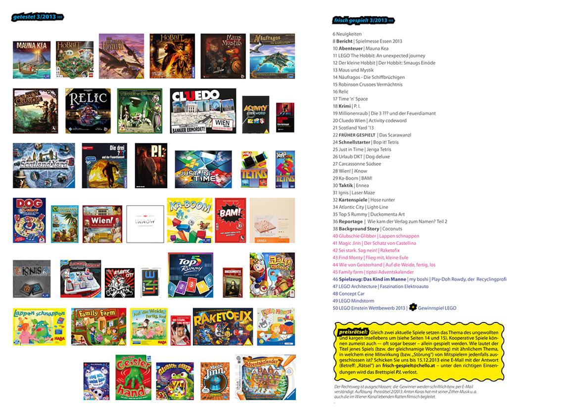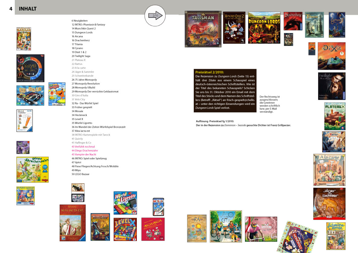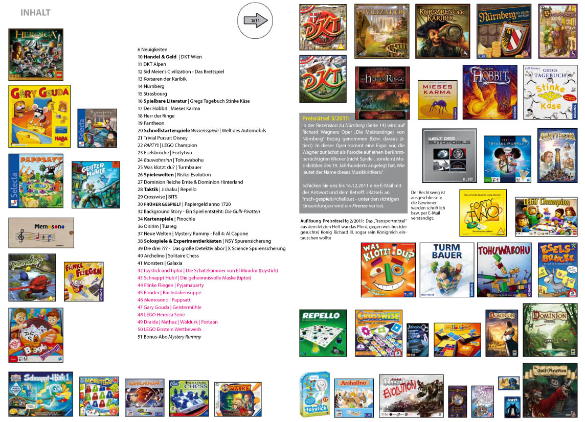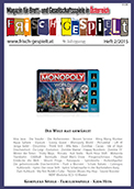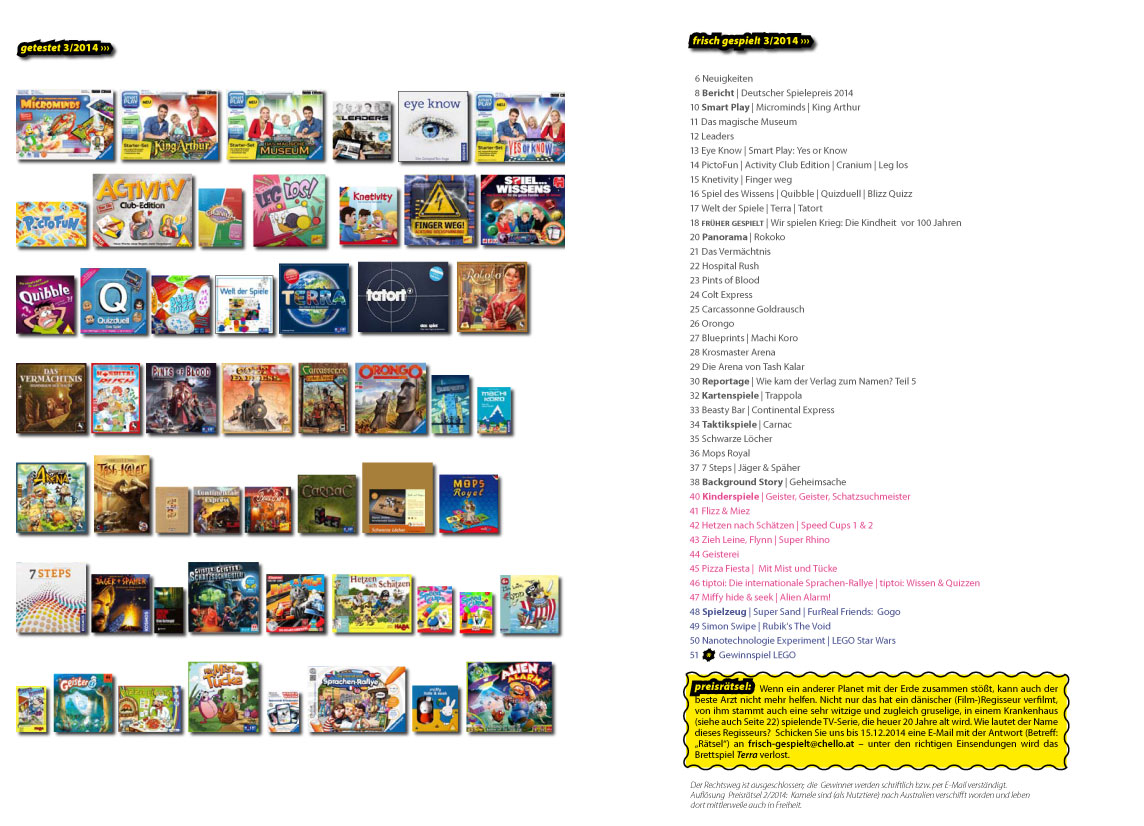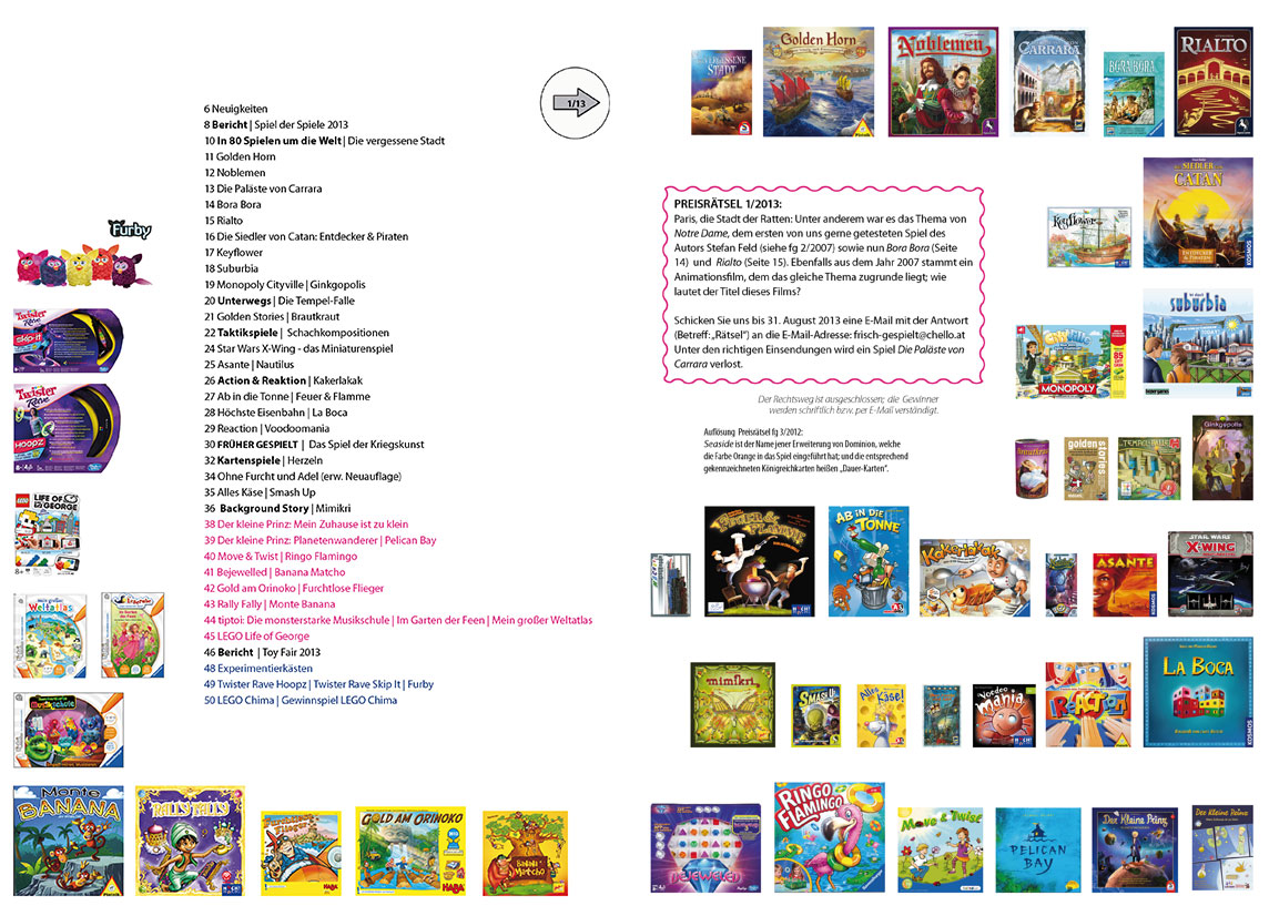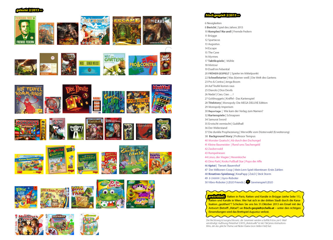 Frisch Gespielt - Das Magazin für Brett- und Gesellschaftsspiele in Österreich erschien 2007 zum ersten Mal. Werfen Sie doch einen Blick in das Inhaltsverzeichnis der jeweiligen PRINT-Ausgaben oder gleich in die um viele Seiten erweiterten Digitalausgaben! Beachten Sie, dass immer nur die letzten fünf Online-Ausgaben abrufbar sind.