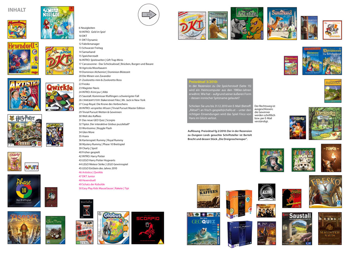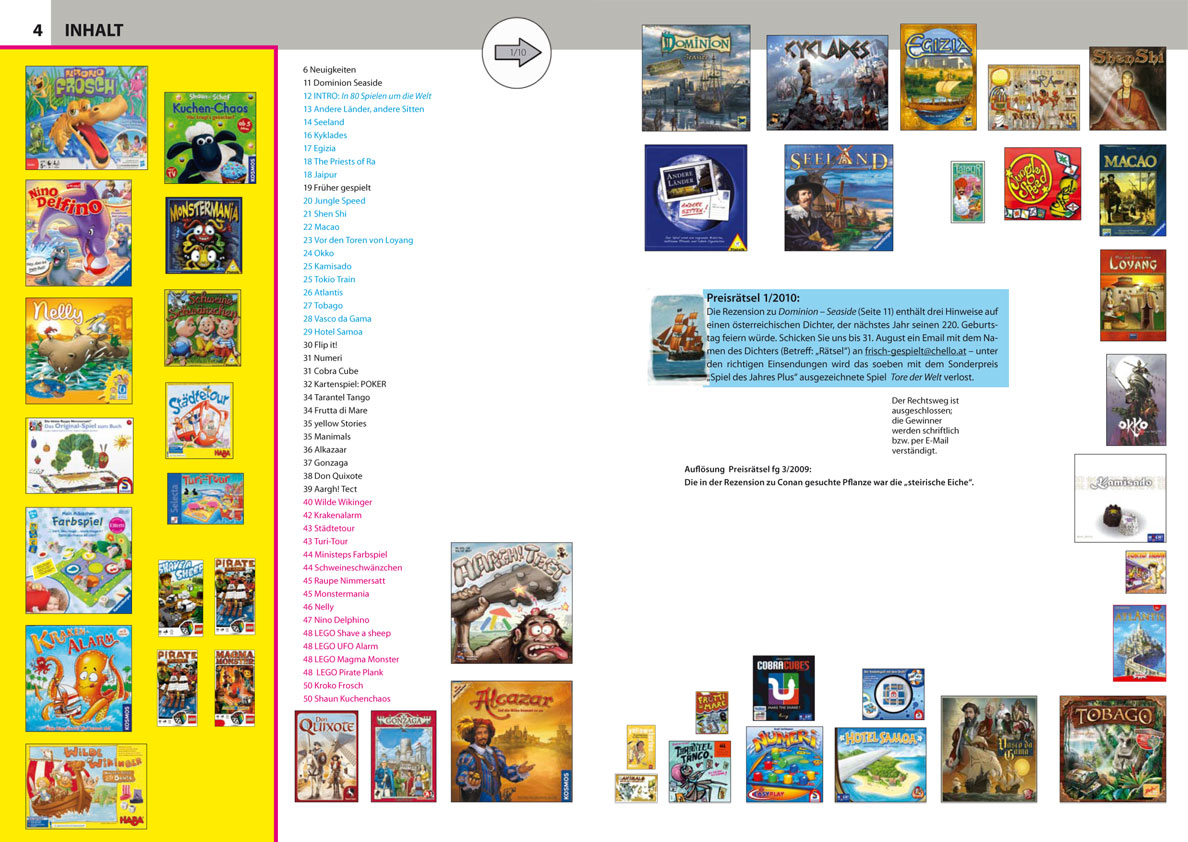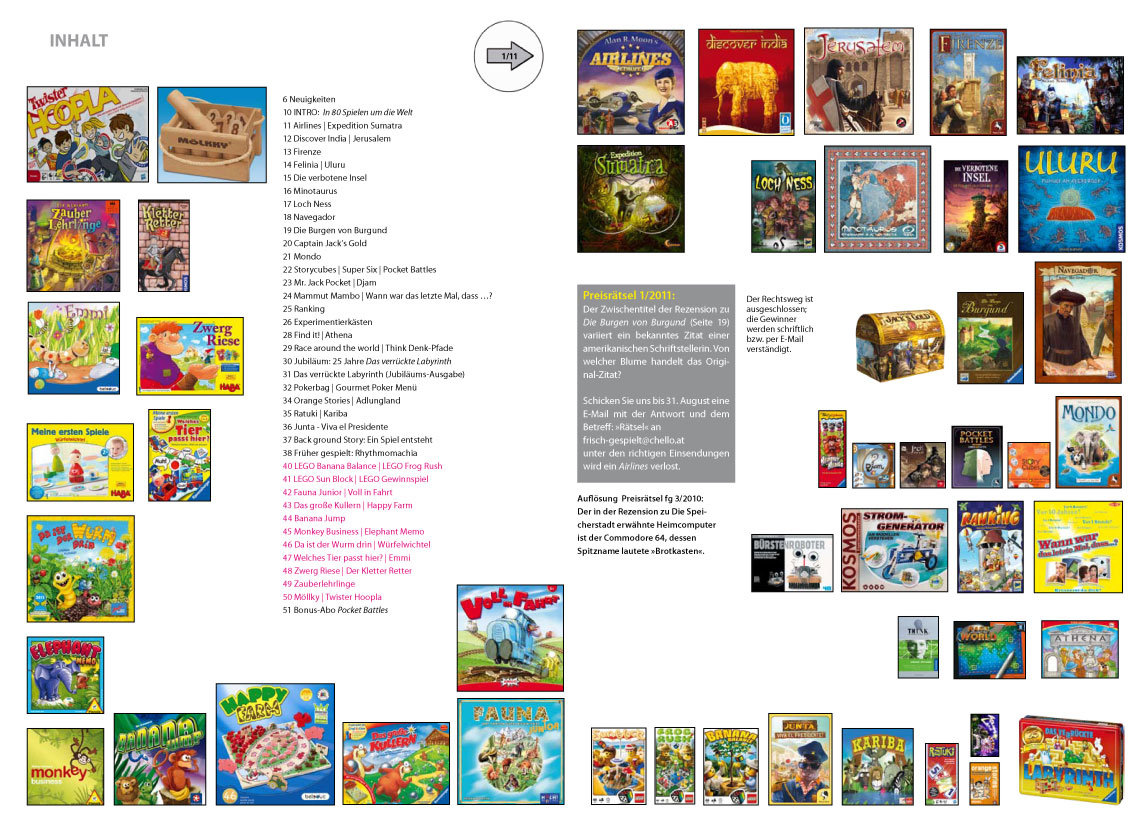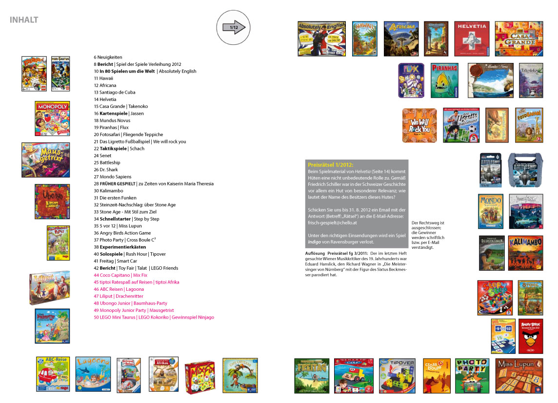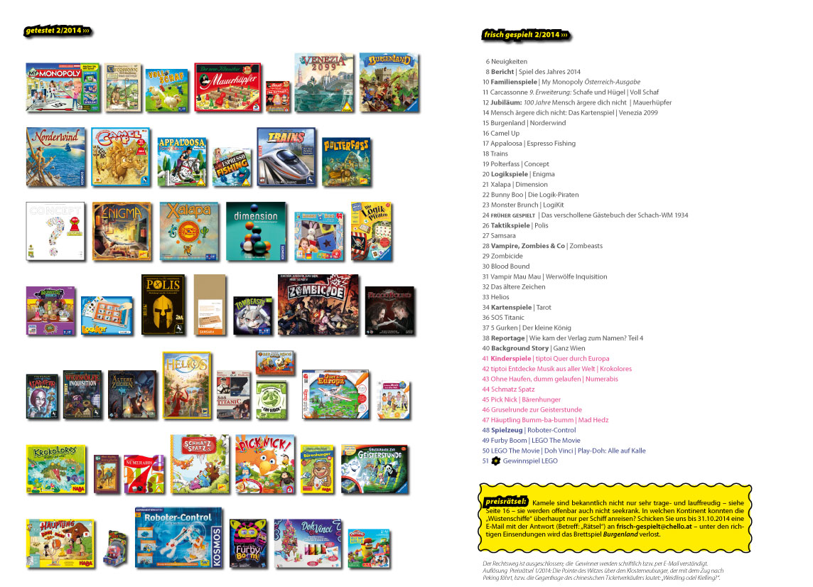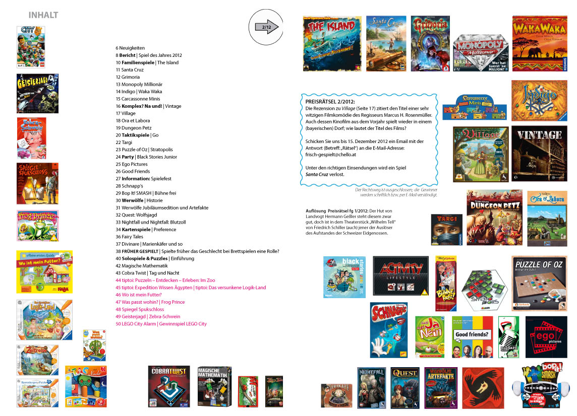 Frisch Gespielt - Das Magazin für Brett- und Gesellschaftsspiele in Österreich erschien 2007 zum ersten Mal. Werfen Sie doch einen Blick in das Inhaltsverzeichnis der jeweiligen PRINT-Ausgaben oder gleich in die um viele Seiten erweiterten Digitalausgaben! Beachten Sie, dass immer nur die letzten fünf Online-Ausgaben abrufbar sind.