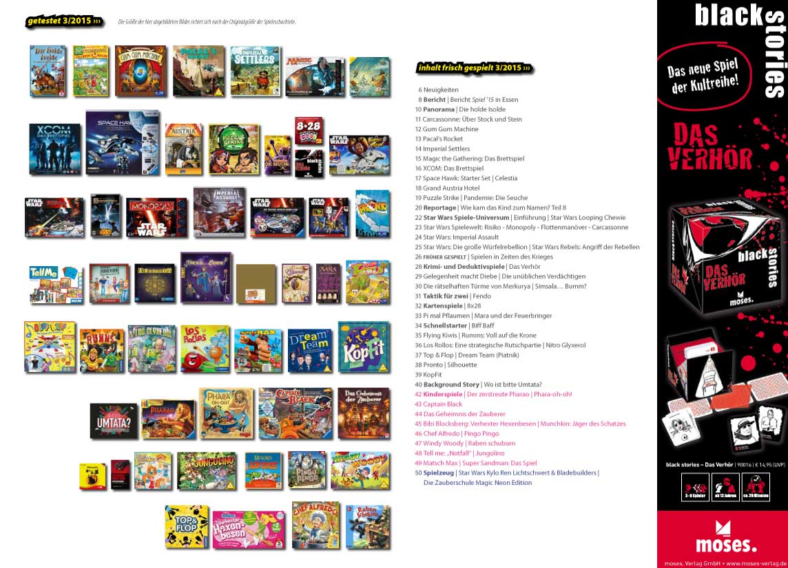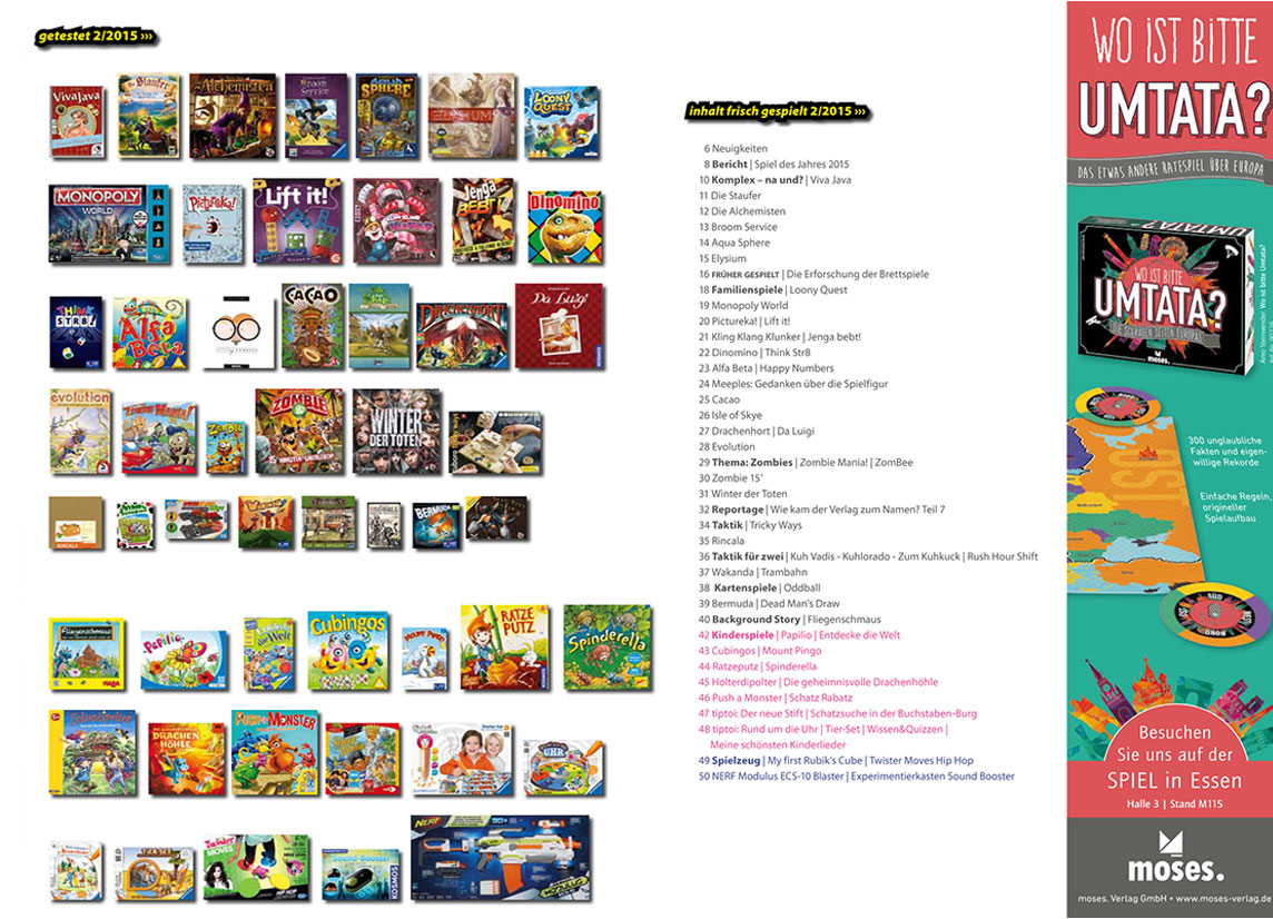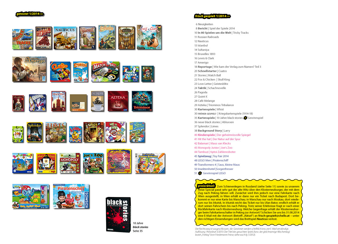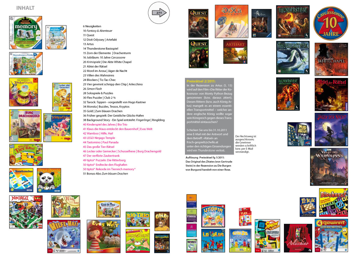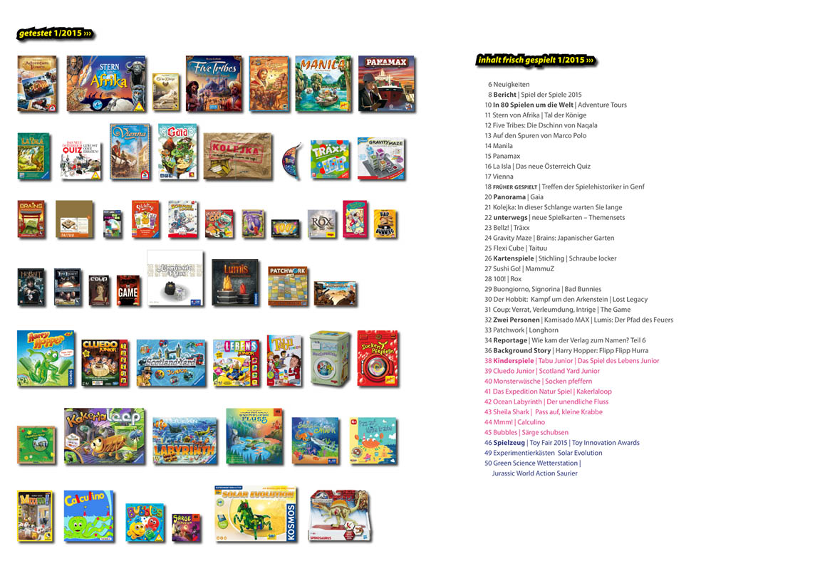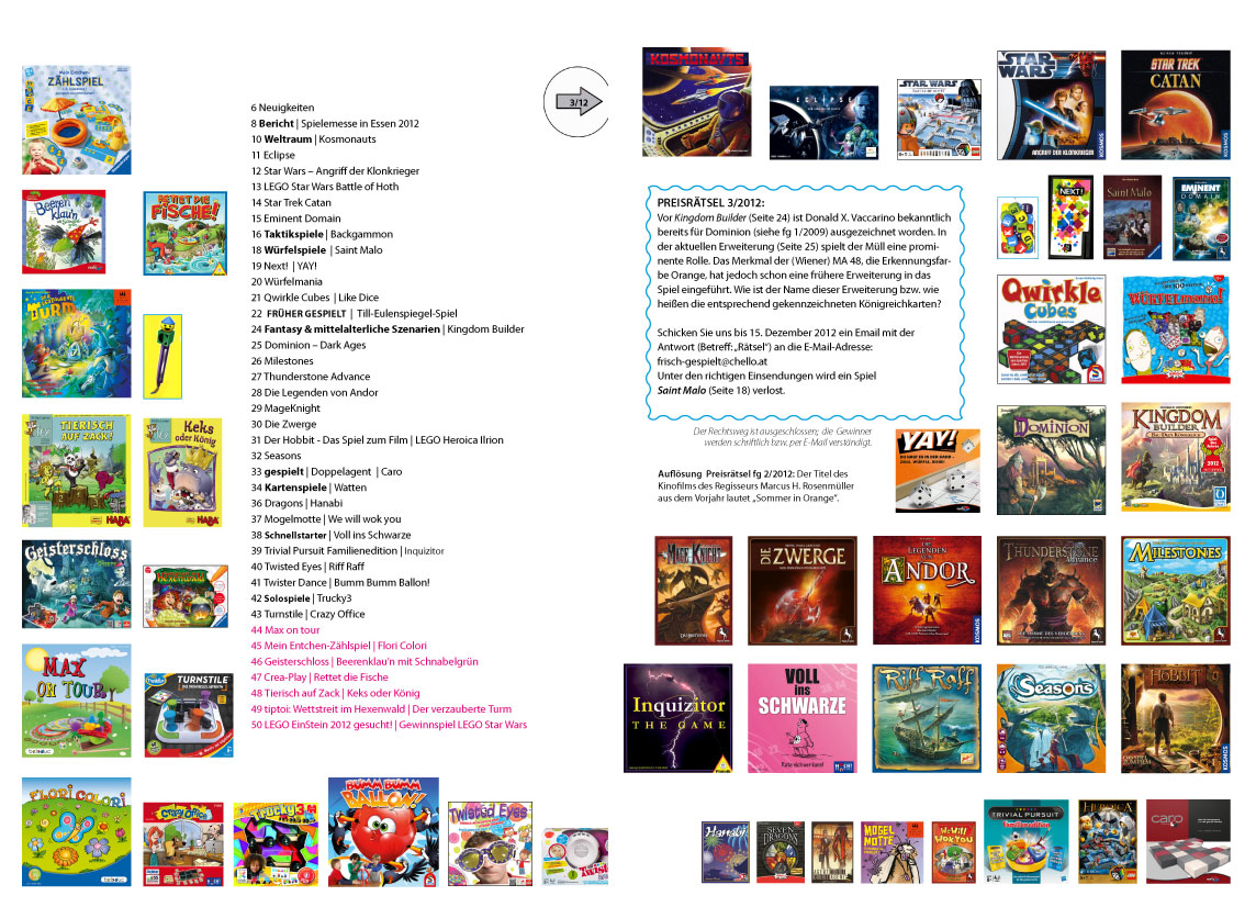 Frisch Gespielt - Das Magazin für Brett- und Gesellschaftsspiele in Österreich erschien 2007 zum ersten Mal. Werfen Sie doch einen Blick in das Inhaltsverzeichnis der jeweiligen PRINT-Ausgaben oder gleich in die um viele Seiten erweiterten Digitalausgaben! Beachten Sie, dass immer nur die letzten fünf Online-Ausgaben abrufbar sind.